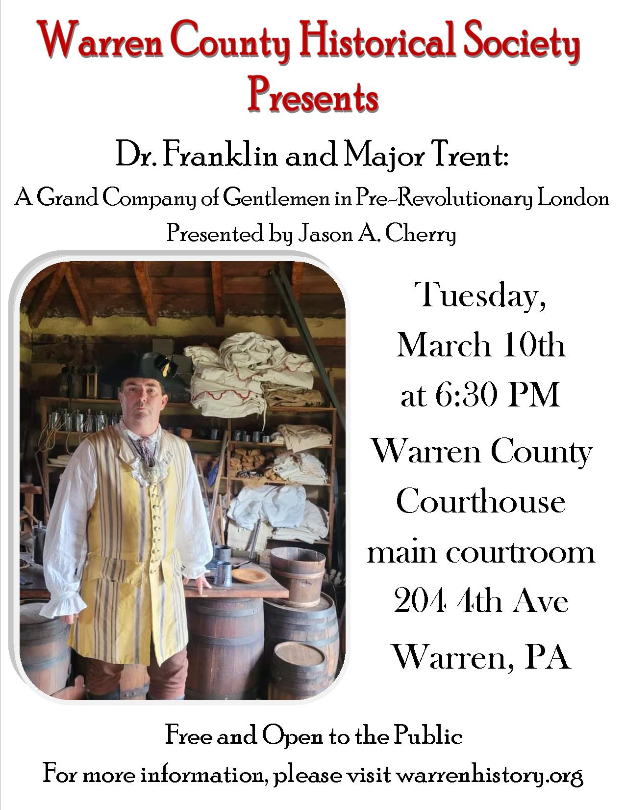 Dr. Franklin and Major Trent: A Grand Company of Gentlemen in Pre-Revolutionary London Presented by Jason A. Cherry Tuesday, March 10, 2026, at 6:30 PM Warren County Courthouse, main courtroom 204 Fourth Avenue, Warren, PA