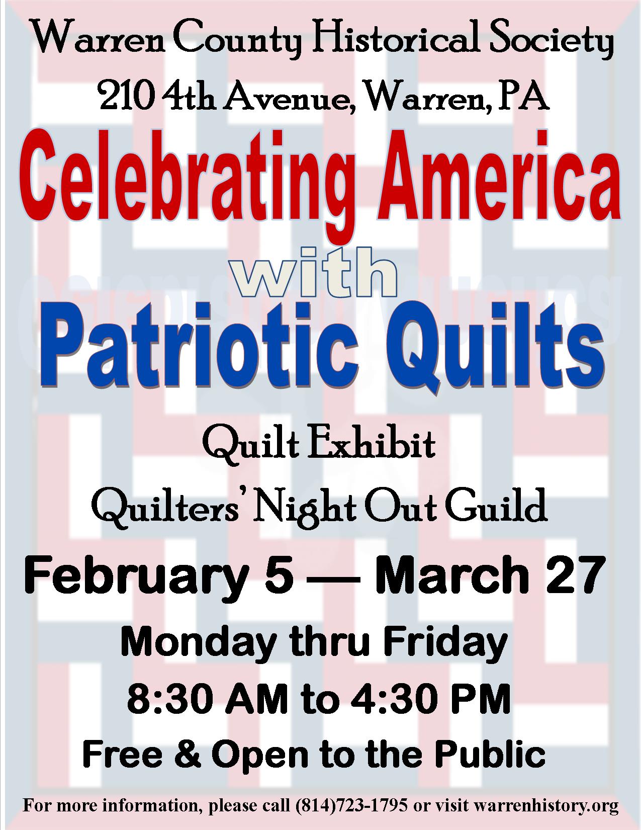 Celebrating America with Patriotic Quilts Exhibit Courtesy of Quilters' Night Out Guild February 5 through March 27, 2026 8:30 AM to 4:30 PM Warren County Historical Society 210 Fourth Avenue, Warren, PA